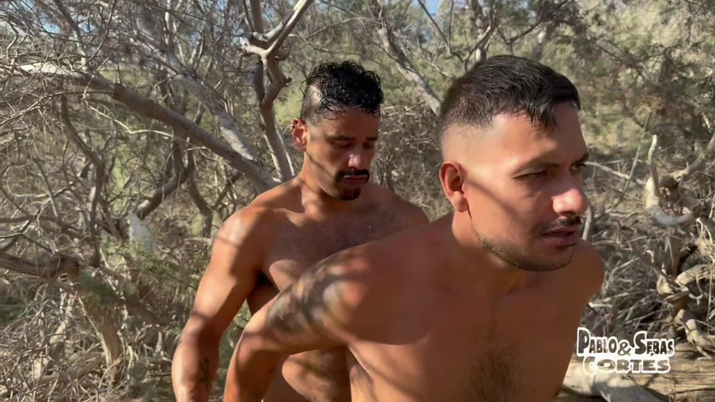 Second round with the sexy couple Pablo and Sebas! Once again we played outside in the dessert - But this time I surprised them with getting on all four to let them fuck me. I even get a dildo up my ass. Hot threeway versatile bareback fucking between three hot Latino men!