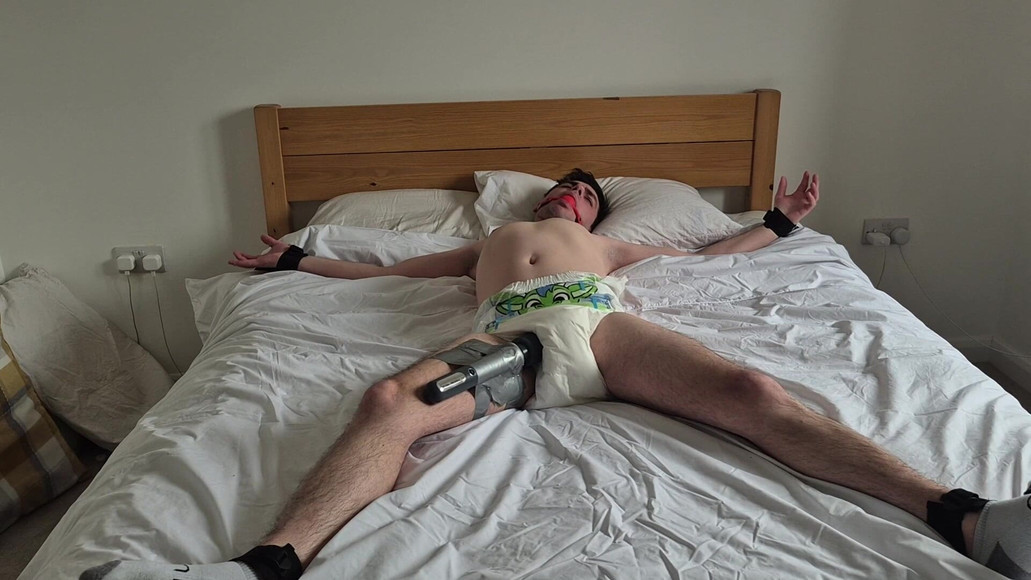 Boy tied to the bed to spend time with the vibrating want