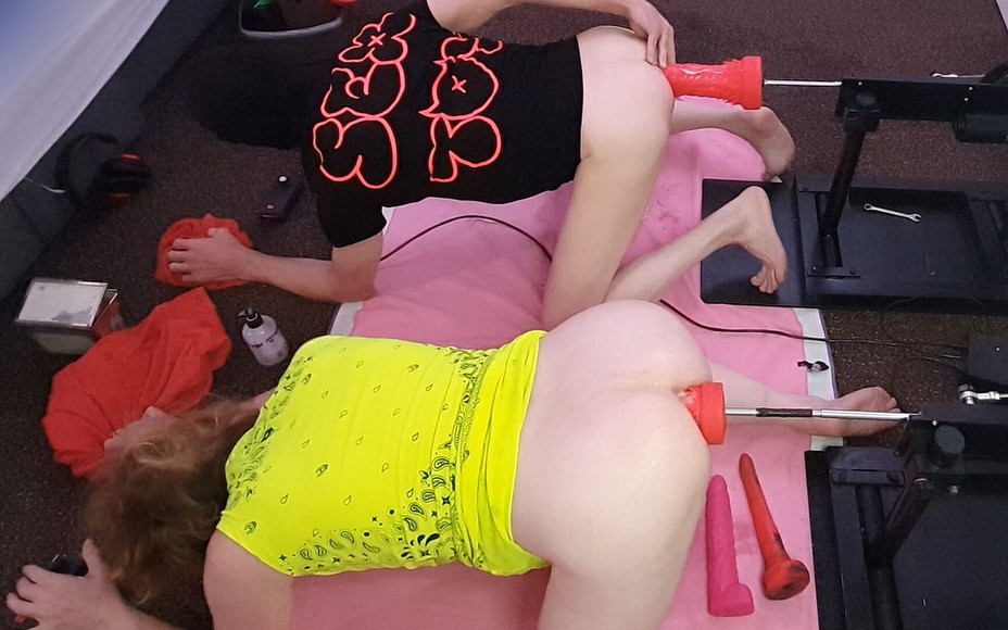 Lisa and her toy are playing with big dildos on 2 fucking machines side by side. Watch them trying to see who can take the biggest dildo.